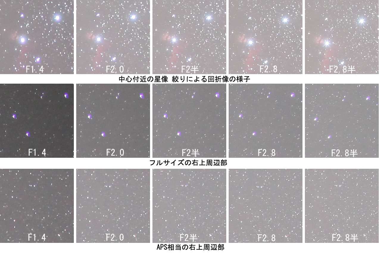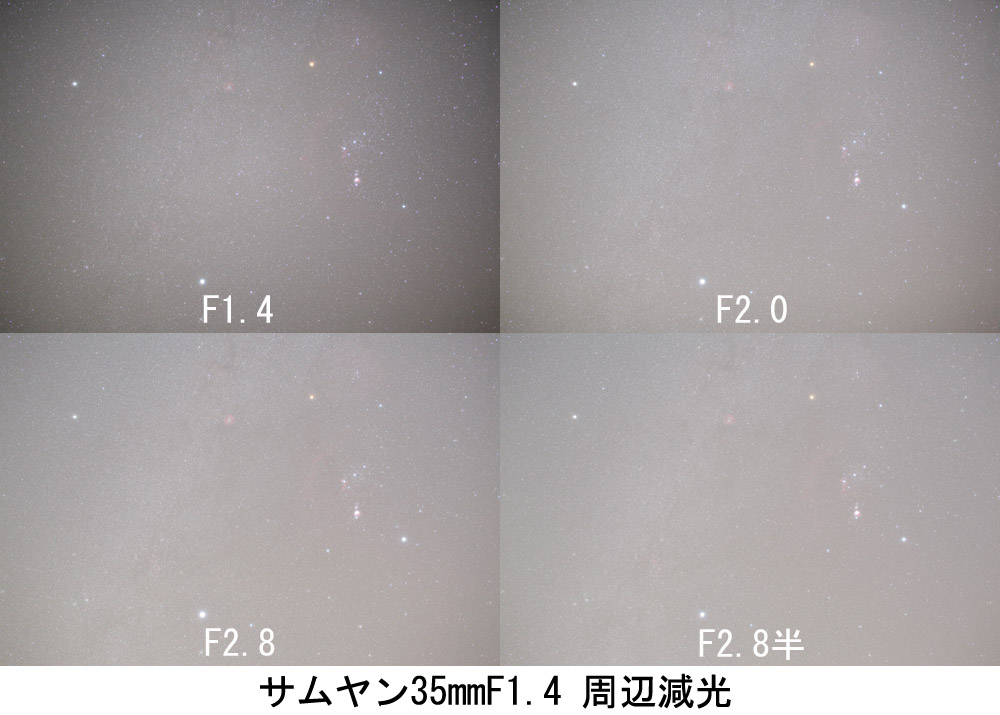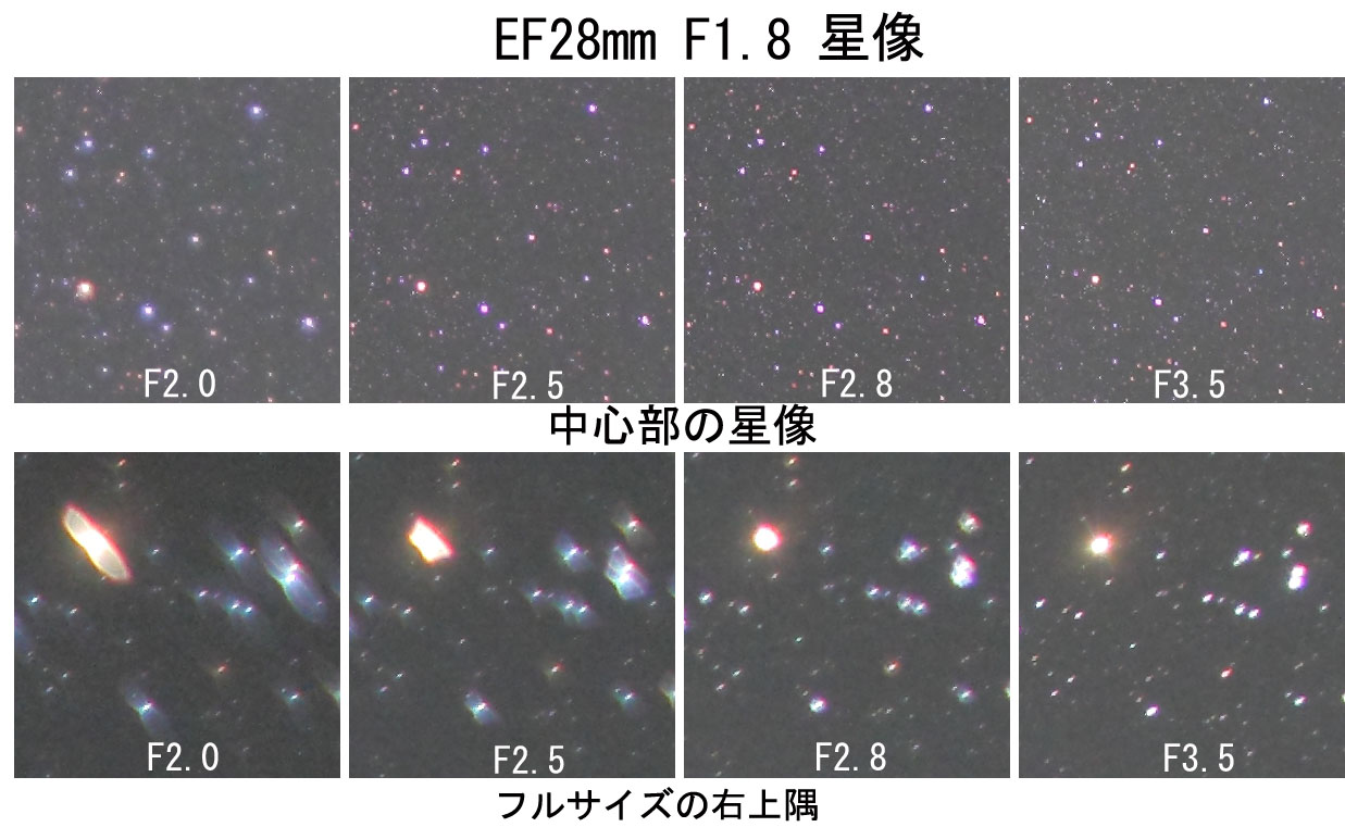 28mmではどちらのレンズも周辺の収差がひどく、EF28mmF1.8のF4と比較して大きく劣ります。Canonの高級Lズームと言えども固定撮影や星座にじみ写真用には使えても、星野ガイド撮影用には向きません。