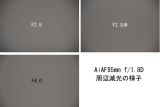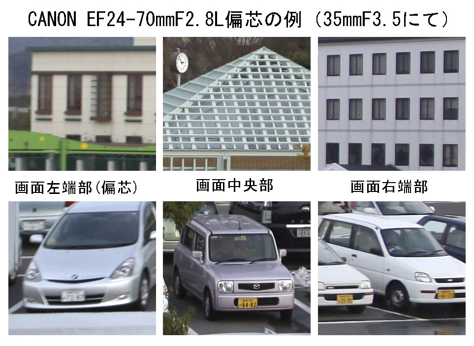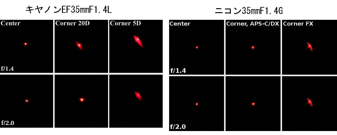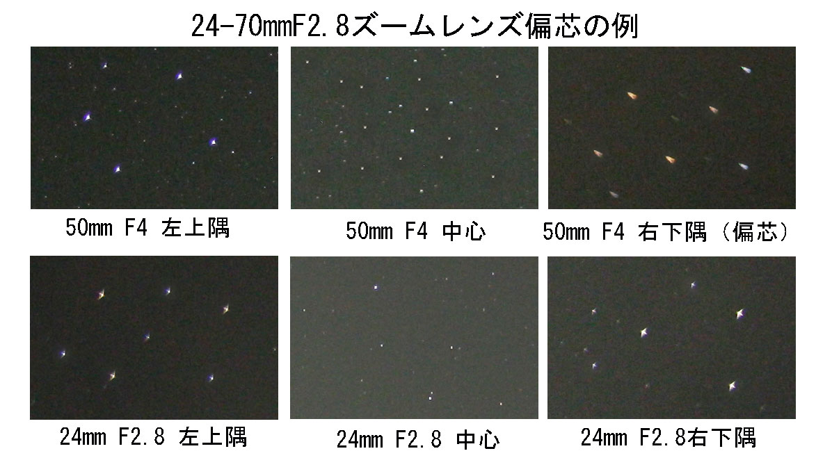 これはNikon24-70mmF2.8の偏芯例ですが、50mmではf4に絞っても右下が偏芯で大きく星像が乱れています。24mmの場合にはF2.8から比較的良好でした。この様にズームレンズの場合にはズーミングによりレンズが動くので、ある焦点域では良好でも、他の焦点域では微妙な偏芯が起きて星像が乱れる為に、星像が安定しないことが多いです。私はキヤノン、ニコン、シグマ、タムロン等のf2.8の大口径標準ズームをテストしたことがありますが、どれも例外なく偏芯による星像の乱れがありました。
