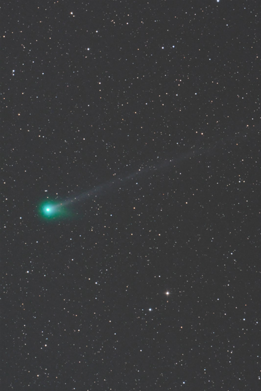 コーチさんがブログで紹介されていたコンポジット方法を使いました。4枚を彗星基準で比較暗とし彗星像だけの画像を作り、それを途中の1枚に比較明で重ねています。追尾は恒星追尾です。SSAGで彗星核が見えていることに途中で気づいたので、核追尾もできたかも。