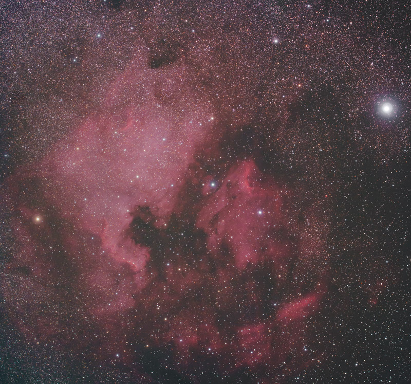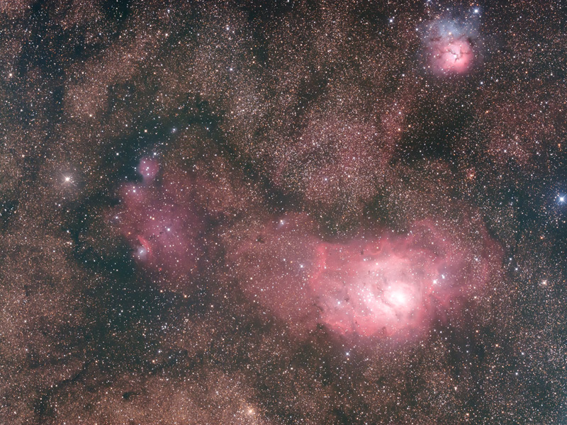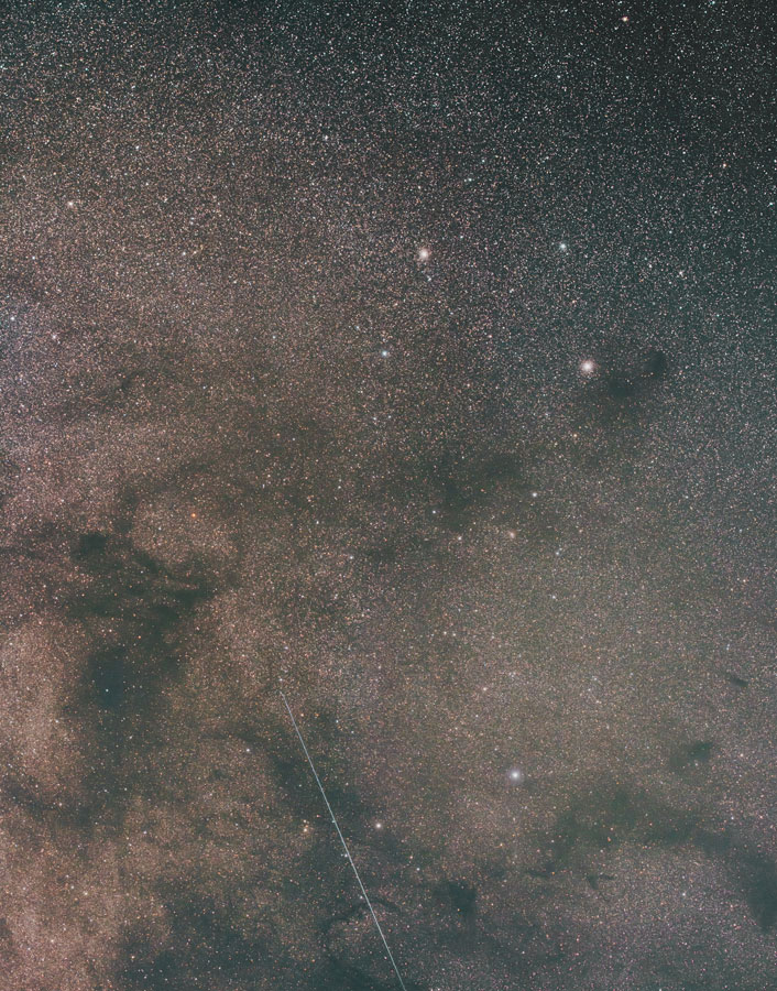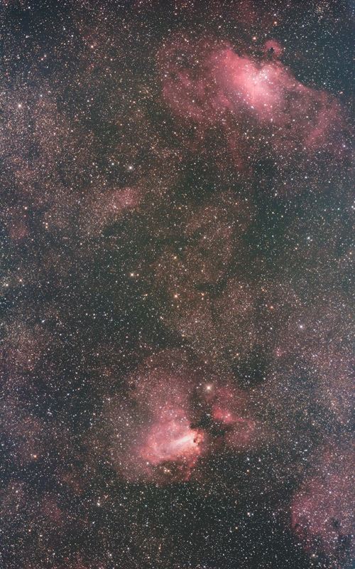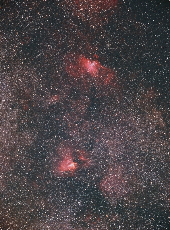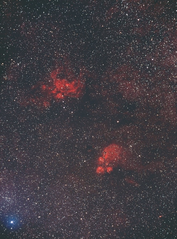 この2枚の画像は素晴らしいですね。銀塩ならではのやわらかい階調ときれいな発色の中でシャープな微恒星におどろきました。自分が撮っていた銀塩よりずっといい作品だと思います。これが一発撮りの30分で撮れてしまうのはやっぱりいいですね。夏の南天は撮影可能時間が短いですから。銀塩でLPSは使ったことはなかったのですが、画像処理でうまく色合いを整えられたのでしょうか。赤い星雲の写りはやはり良くなりそうですね。