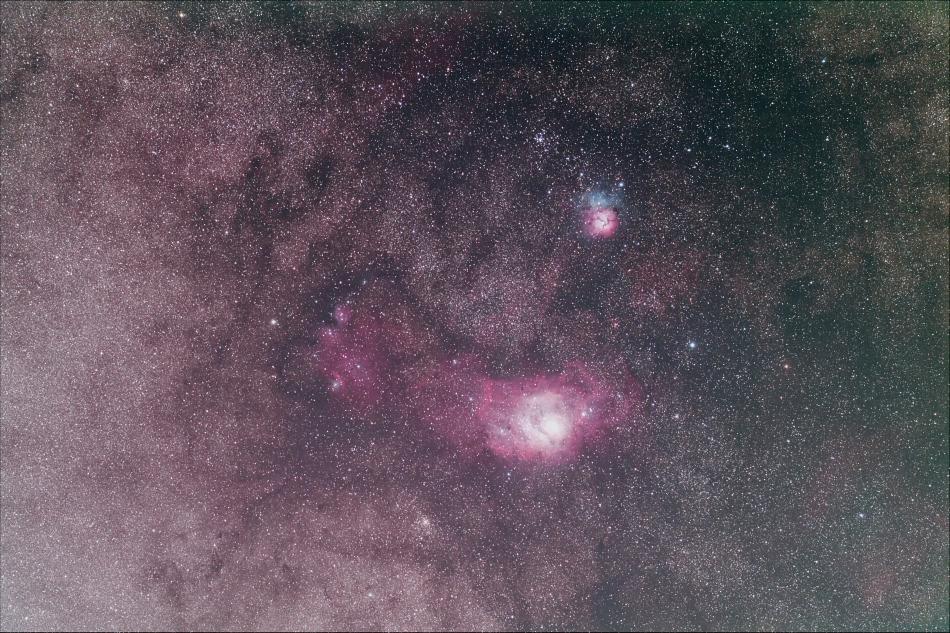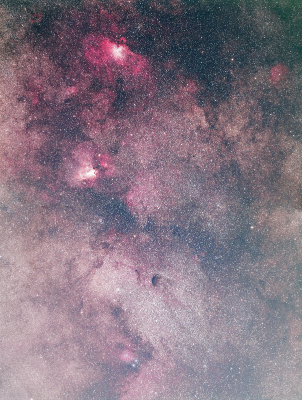綺麗な天の川ですね。色合いといい天の川や暗黒帯の出方といい、ナチュラル仕上げでいい感じです。私のは部分的拡大なので色の強調がしやすいです。コーチさんのような星野で星雲を強調するとバランスが崩れて見えてくると思います。